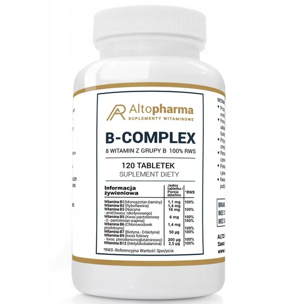Witamina B Complex 100% RWS od Altopharma to wysokiej jakości suplement diety, zawierający zestaw 8 witamin z grupy B. Każda tabletka dostarcza 100% dziennego zapotrzebowania na te witalne składniki odżywcze, wspierając prawidłowy metabolizm energetyczny, układ nerwowy, odporność i funkcje psychiczne.