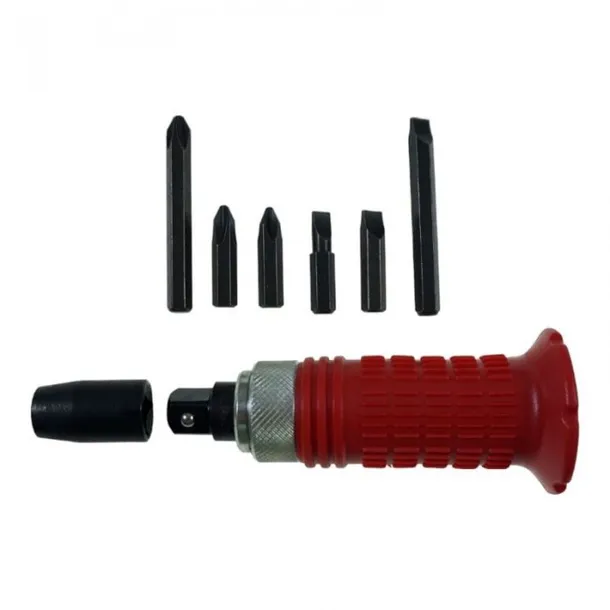 Sposób użycia: Załóż odpowiednią końcówkę na wkrętak (w zależności od rodzaju śruby lub nasadki jaką chcesz odkręcić). Przyłóż wkrętak do śruby i uderzaj energicznie młotkiem w tył wkrętaka.Aby odkręcić nakrętkę lub śrubę sześciokątną zdejmij z wkrętaka przełączkę do bitów i zamontuj nasadkę z gniazdem 1/2".