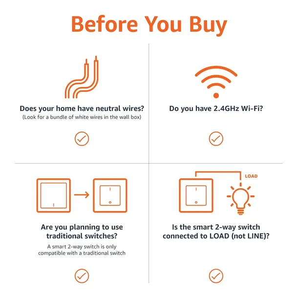 - Instalacja z przewodami neutralnymi, wymaga połączenia z siecią Wi-Fi 2,4 GHz oraz podłączenia do obciążenia, a nie do linii.