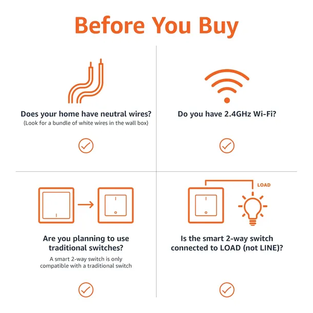 - Wymaga przewodów neutralnych, 2.4 GHz Wi-Fi, inteligentny ściemniacz musi być podłączony do obciążenia (nie do linii).