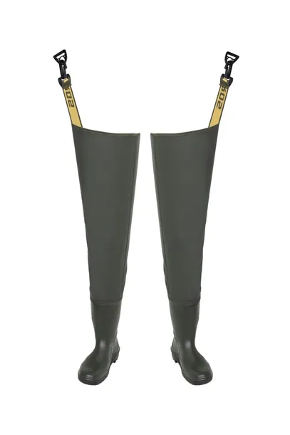Wodery z wgrzanymi na stałe wysokiej jakości kaloszami. Model produkowany z wodoochronnego, wytrzymałego materiału zapewniającego skuteczną ochronę nóg przed wodą. Technika obustronnego zgrzewania zwiększa wytrzymałość szwów. Wyposażone w wygodne, gumowe mocowania podtrzymujące.