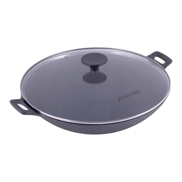 Okrągły wok żeliwny z pokrywką szklaną o średnicy 30 cm, doskonale rozprowadza i utrzymuje ciepło. Idealne do gotowania, smażenia orientalnych potraw.