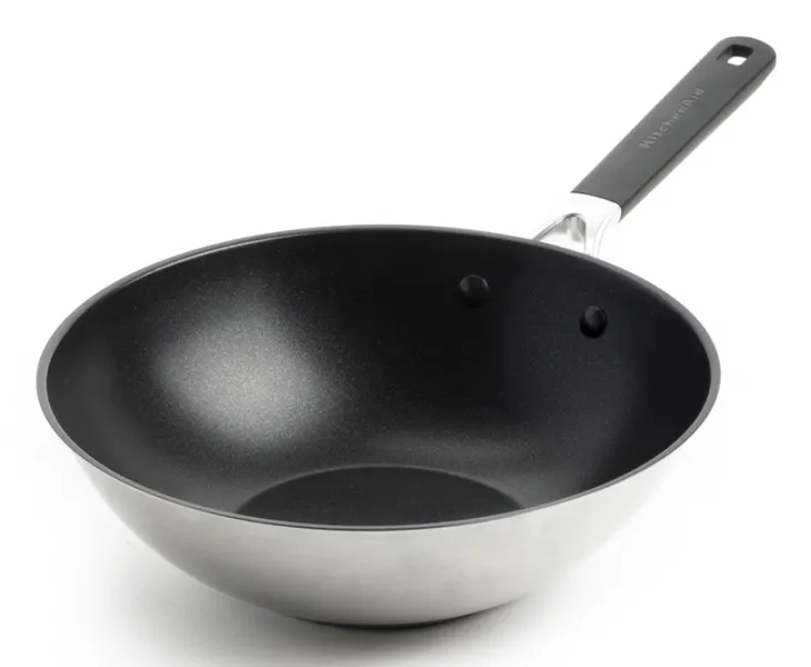 KitchenAid CC005705-001. Kształt: Okrągły, Model: Wok/Patelnia do mieszania, Kolor produktu: Czarny, Stal nierdzewna. Średnica: 28 cm, Szerokość produktu: 285 mm, Głębokość produktu: 105 mm. Ilość na paczkę: 1 szt.. Nie zawiera: PFAS