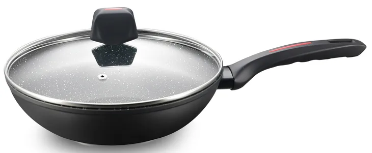 Wok wykonany jest z wysokiej jakości kutego aluminium pokrytego nieprzywieralną powłoką marmurkową. Dzięki takiej temu w tym woku można gotować, dusić oraz smażyć z użyciem minimalnej ilości tłuszczu.