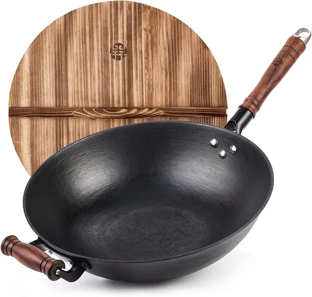 Stalowa patelnia WOK z drewnianą rączką – nadaje się na kuchenkę, do piekarnika i na grilla