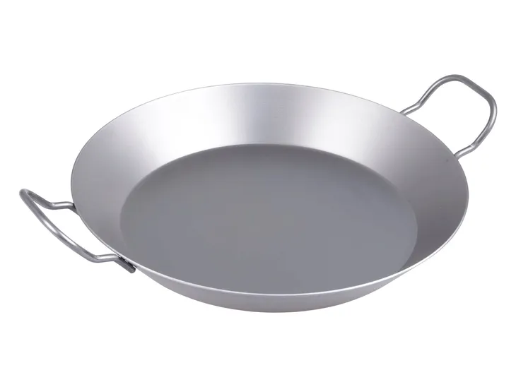 Wok żelazny, Ø = 32 cm, Ø 32 cm, z 2 uchwytami, z żelaza, grubość 2 mm, Ø dołu (dół) = 24,5 cm, Ø góry = 32,00 cm, wysokość = 4,5 cm, pojemność = ok. 2,6 l, grubość materiału 2 mm, w banderoli