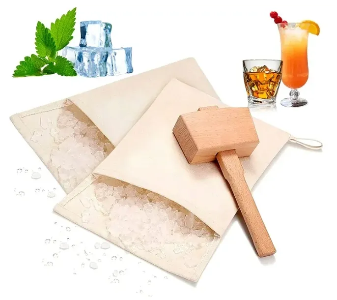 Zestaw zawiera 1 młotek i 2 lniane worki na lód, wytrzymały worek z płótna żaglowego z zamknięciem składanym jest przeznaczony do wypełniania kostek lodu, a drewniany młotek do kruszenia lodu.
