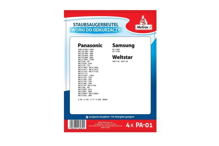 Podczas gdy papierowe worki trzeba wymieniać bardzo często, produkt marki Metrox działa dwukrotnie dłużej. Worki PA -01 są przeznaczone do stosowania w odkurzaczach marki Panasonic, Samsung i Weltstar. Aby cieszyć się higieną i niezwykłym zapachem, polecamy używanie wraz z workami ulubionego zapachu do odkurzacza.