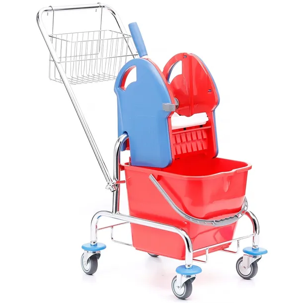 Wózek do sprzątania jednowiadrowy chromowany, wiadro 20 l, prasa do mopów, koszyk metalowy