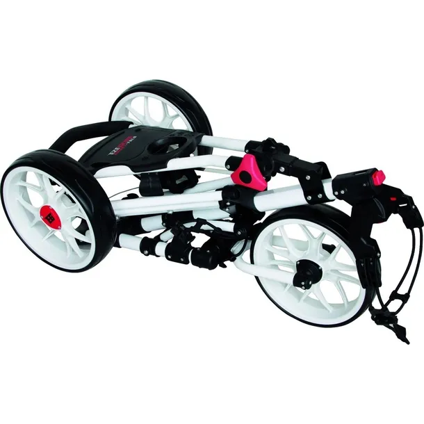 - punkt znaku wypunktowania: Wózek 3-kołowy Premium, Jedno dotknięcie, łatwe składanie, Wielofunkcyjny uchwyt na karty wyników z suchą przestrzenią na kosztowności i sprzęt, Zawiera 2 x pokrowce na koła i luksusowy uchwyt na parasol, Łatwy w użyciu hamulec nożny, lekka, trwała aluminiowa rama.