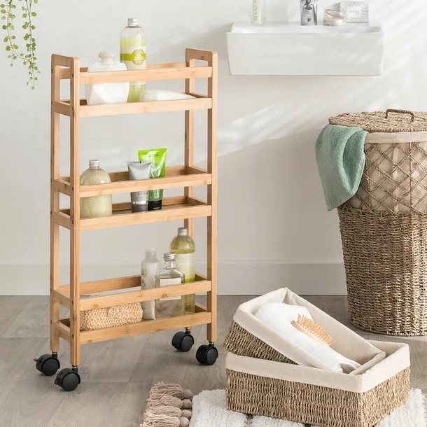 Wózek Narrow to eleganckie i funkcjonalne rozwiązanie, które ożywi przestrzeń twojej łazienki. Wykonany z naturalnego drewna bambusowego, wózek posiada trzy głębokie półki z płyty MDF, umożliwiając przechowywanie kosmetyków, ręczników i innych potrzebnych przedmiotów. Solidna konstrukcja, drewniane uchwyty oraz mobilne plastikowe kółka zapewniają wygodę użytkowania.