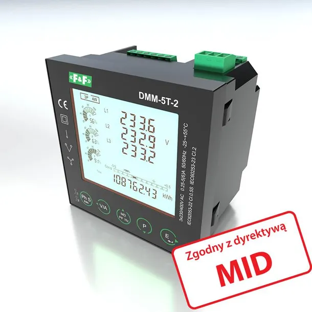 Wielofunkcyjny wskaźnik parametrów sieci. Jednofazowy i trójfazowy. Posiada certyfikat zgodności z MID.Przeznaczenie