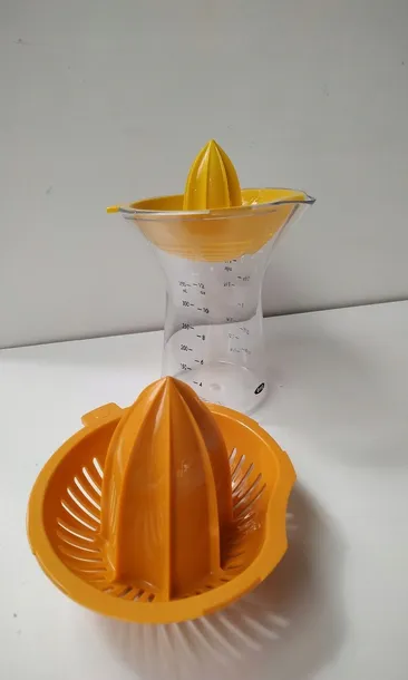 Duża pojemność pojemnika na wyciśnięty sok jest wystarczająca, aby zmieścić porcję świeżo wyciskanego soku zarówno do bezpośredniego wypicia, przygotowania dressingu na bazie soku z cytryny lub dodatku soku do przyrządzenia deseru. Pojemnik na sok jest wyprofilowany, aby zapewnić maksymalnie pewny chwyt podczas wyciskania. Wyprofilowany dzióbek ułatwia przelewanie soku, bez rozlewania i kapania. Miarka na pojemniku odmierza pojemność w mililitrach (ml), uncjach (oz) oraz szklankach (cup). Wymienne nakładki montowane są do pojemnika za pomocą zatrzasków, dzięki którym są stabilnie przymocowane i nie przemieszczają się podczas pracy oraz przelewania soku do końcowego naczynia np. szklanki, miski. Wyciskacz wykonano z materiałów wolnych od BPA. Można myć w zmywarce.