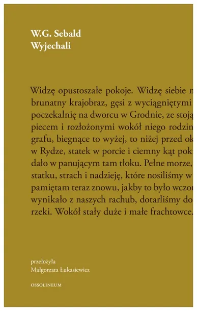 Henry Selwyn, któremu większość dni mija na liczeniu źdźbeł trawy w zapuszczonym ogrodzie Paul Bereyter, zżerany wewnętrzną samotnością emerytowany nauczyciel w prowincjonalnej szkole Ambros Adelwarth, niemal doszczętnie unicestwiony wujeczny dziadek narratora Max Ferber, malarz, zatracający się w kompulsywnych aktach twórczych. Tych, którzy wyjechali, łączą melancholia, poczucie utraty i wyrugowania z życia. To przede wszystkim opowieść o wstydzie – pisze w posłowiu Katarzyna Kończal. – Bohaterowie odczuwają swoje życia i pragnienia jako pozbawione legitymizacji – dlatego stopniowo wycofują się, jak gdyby po tym wszystkim, co się wydarzyło, wstydzili się swojego czynnego bycia w świecie. Co więcej, sami wytaczają sobie proces. Wyjechali jest książką nie tylko o uchodźczym losie, lecz także o życiu w cieniu traum oraz doświadczeń XX wieku – w cieniu wojen i zrujnowanych miast, Zagłady i emigracji.