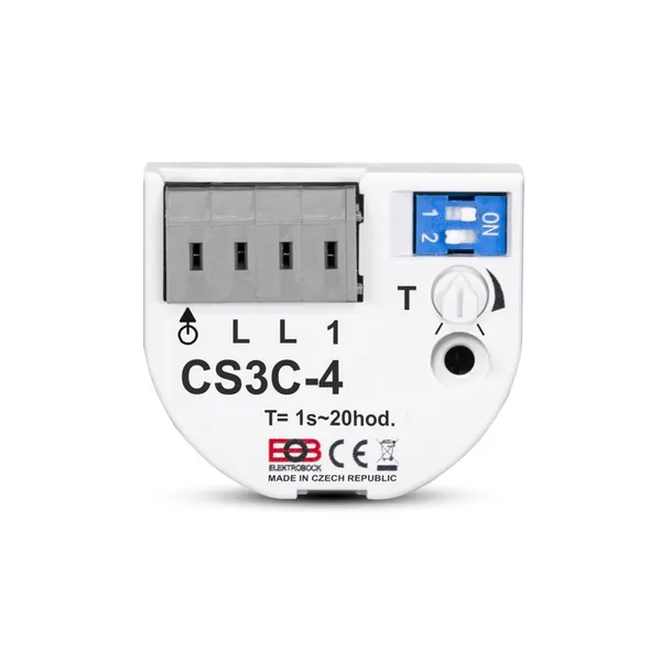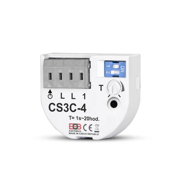Wyłącznik czasowy CS3C-4 z zaciskami bezśrubowymi służy do opóźnionego wyłączania odbiornika. Opóźnienie odliczania następuje po naciśnięciu przycisku do wyłączenia.Funkcja: do wentylatorów w łazienkach lub jako automat schodowy.