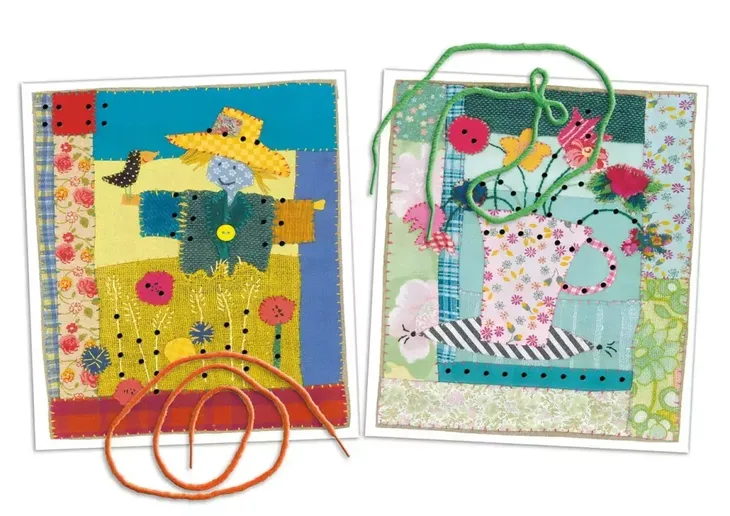 No to do roboty! W pudełku znajdziesz kolorowe sznureczki i piękne patchworkowe obrazki. A na obrazkach zobaczysz lokomotywę, stracha na wróblę, kota, bałwanka i inne cuda. Teraz możesz wyszywać nawet bez igły. Wesołej zabawy!