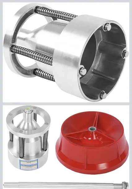 - Głowica z poziomicą: Srebrny element z wbudowaną „oczkową” poziomicą (libellą) nakłada się na pionowy trzpień.