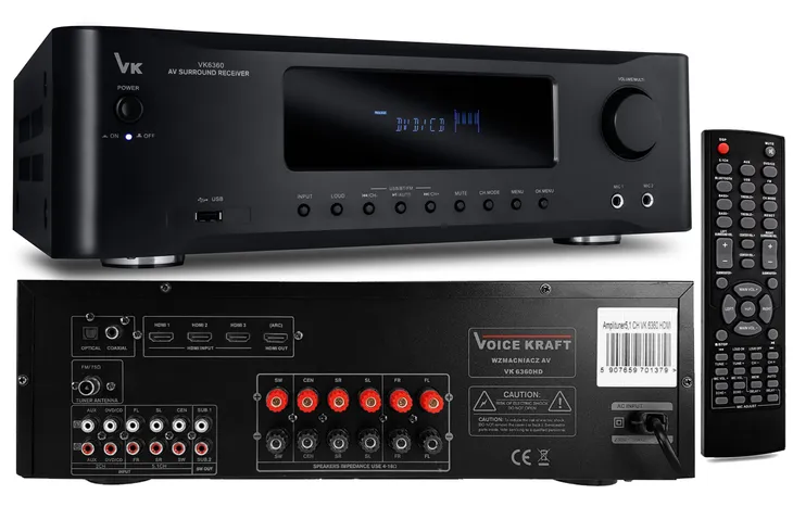 Wzmacniacz Hi-Fi VK 6360 HDMI który posiada bogaty zestaw funkcji i opcji podłączeń to idealne rozszerzenie istniejących systemów Hi-Fi. Ten zintegrowany z radiem FM posiada wbudowany odbiornik BT, port USB do odtwarzania plików MP3. Bardzo istotną funkcją tego wzmacniacza są 3 wejścia HDMI jak również jedno wyjście HDMI z funkcją ARC. Na uwagę zasługuje bezprzewodowa funkcja BT 4.0 streaming, dzięki której odbiornik Hi-Fi gwarantuje niezawodne przesyłanie dźwięku ze smartfona, tabletu lub laptopa. Wzmacniacz posiada również wejście optyczne i coaxial dzięki czemu możemy uzyskać wysokiej jakości dźwięk. Aby ułatwić sterowanie, wystarczy skorzystać z pilota, który pozwala na wygodne, obsługiwanie odbiornika Hi-Fi z pewnej odległości. Przejrzysty, kolorowy wyświetlacz zapewnia stały dostęp do aktualnych informacji o odtwarzanej muzyce, stacjach radiowych. Wbudowany procesor DSP zapewnia najlepszą jakość dźwięku w naszym salonie odsłuchowym. Podłączony system kolumn w systemie 2.1 lub 5.1 umożliwi najlepszą reprodukcję dźwięku.