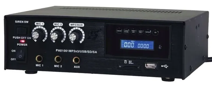 o mocy 60W (45W RMS) wyposażony jest w odtwarzacz muzyki MP3 z wejściem USB i SD, świetnie sprawdzi się w zastosowaniach mobilnych dzięki zasilaniu 12V (np. samochód, przyczepa kempingowa, łódź itp.), można go też oczywiście używać ze standardową instalacją sieciową 230V. Wzmacniacz został bardzo solidnie i estetycznie wykonany, posiada solidną obudowę, funkcjonalne wejścia na przednim panelu, podświetlany na niebiesko ekran LCD, potrójną regulację głośności dla każdego kanału na panelu przednim oraz przycisk uruchamiający syrenę alarmową. W komplecie do wzmacniacze dołączone jest ramię montażowe, umożliwiające podwieszenie urządzenia, a także pilot zdalnego sterowania - do obsługi wbudowanego odtwarzacza MP3.