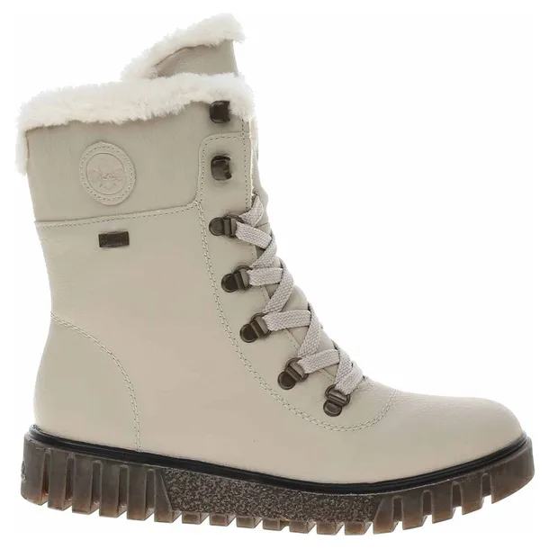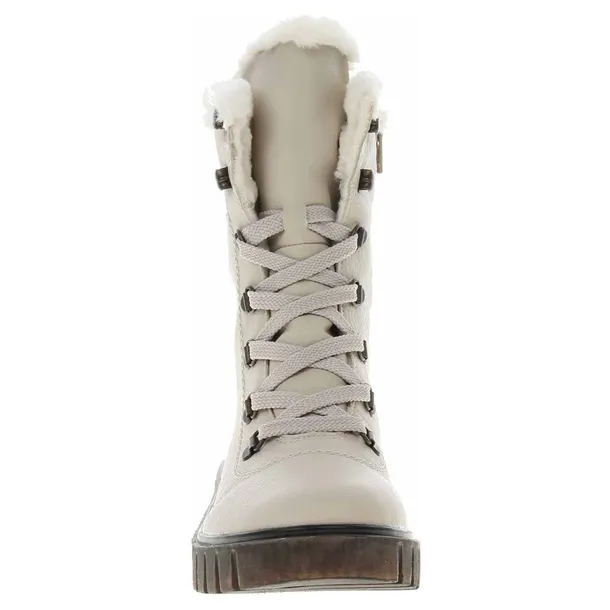 Obuwie niemiecko-szwajcarskiej marki Rieker zachwyca oryginalnymi połączeniami, dbałością wykonania oraz modnym designem połączonym z wygodą i klasycznym stylem. Nowa propozycja tej marki to niezwykle wygodne i zapewniające dużo ciepła, cudowne botki, trzewiki damskie. Cholewka została wykonana z tkaniny i wysokogatunkowego tworzywa w kolorze beżowym. Na wewnętrznej stronie cholewki zamek ułatwiający zmianę obuwia, a sznurowadła pozwalają lepiej dopasować obuwie do stóp. Okrągły nosek daje palcom dużo swobody i pozwala na wygodne ułożenie stóp. Świetnie wyprofilowana podeszwa z wysokogatunkowego tworzywa w połączeniu z wkładką antistress daje niesamowite poczucie komfortu i wygody. Wysokość platformy z przodu 2,5 cm, a z tyłu 3,5 cm. Wnętrze i wkładka to miękki polar, który doskonale chroni stopy przed zimnem. Bardzo lekkie, niesamowicie wygodne, doskonale sprawdzą się w połączeniu z sukienką czy spodniami.