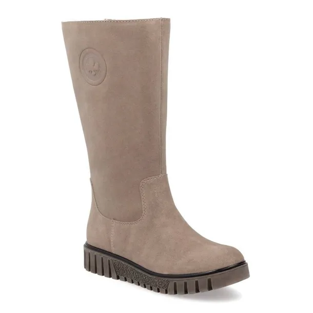 Nowa propozycja od marki Rieker to wyjątkowo komfortowe, ocieplane kozaki damskie. Wykonane z zamszowej skóry w beżowym kolorze, posiadają suwak na wewnętrznej stronie cholewki, co ułatwia ich zakładanie i zdejmowanie. Okrągły nosek zapewnia przestrzeń dla palców, gwarantując wygodę noszenia. Wnętrze i wkładka zostały wyściełane miękką, ocieplaną tkaniną, która skutecznie chroni stopy przed zimnem w chłodniejszych miesiącach. Kozaki osadzone są na platformie, której wysokość wynosi od 2 cm z przodu do 3,5 cm z tyłu. Idealne do wielu stylizacji, gwarantują niebywały komfort.
