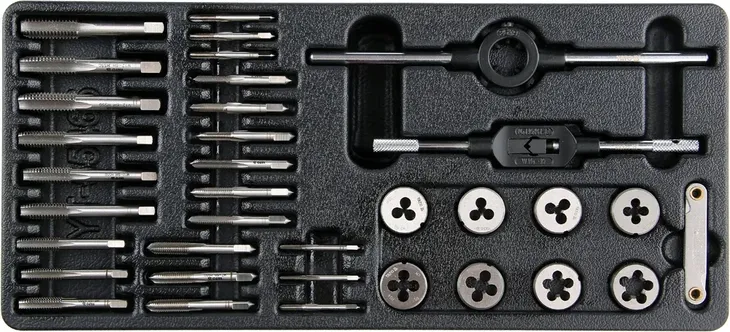 Wkład do szuflady zawierający 35-elementowy zestaw narzynek i gwintowników. - wkład - gwintowniki 3xM3x0.5, 3xM4x0.7, 3xM5x0.8, 3xM6x1.0, 3xM7x1.0, 3xM8x1.25, 3xM10x1.5, 3xM12x1.75 - narzynki M3x0.5, M4x0.7, M5x0.8, M6x1.0, M7x1.0, M8x1.25, M10x1.5, M12x1.75 - pokrętło do narzynek - pokrętło do gwintowników - szczelinomierz 0.5-1.75 mm