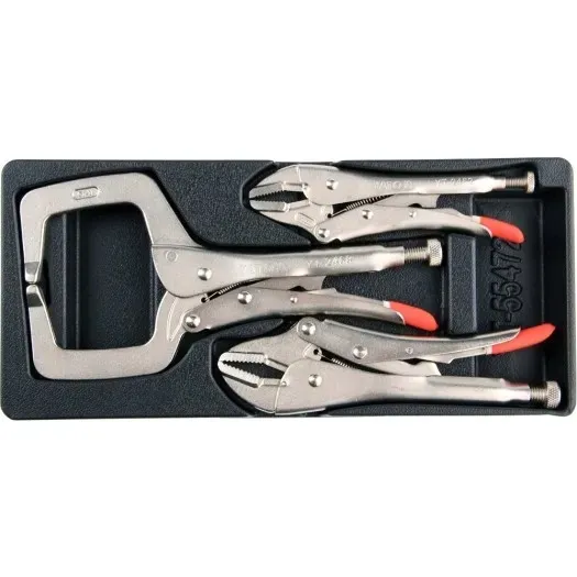 Wkład do szuflady zawierający szczypce samozaciskowe 3 sztuki. Szczypce zatrzaskowe, pozwalają na szybkie zaciskanie szczęk na materiale. Niezwykle przydatne przy spawaniu, nitowaniu, czy wierceniu. Zwalnianie zacisku za pomocą specjalnej dźwigni.