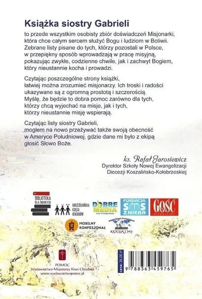 Książka siostry Gabrieli, to przede wszystkim osobisty zbiór doświadczeń Misjonarki, która chce całym sercem służyć Bogu i ludziom w Boliwii. Zebrane listy pisane do tych, którzy pozostali w Polsce w przepiękny sposób wprowadzają..