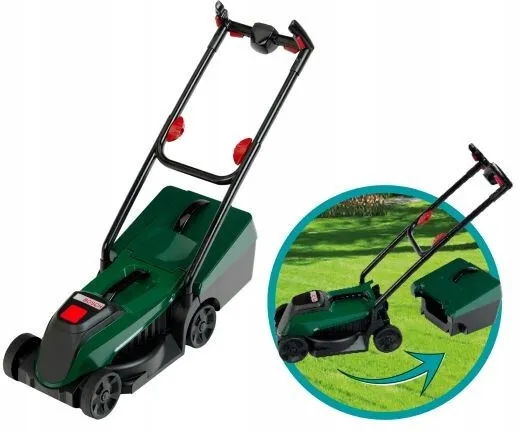 KL 2780 Kosiarka Bosch NEW Kosiarka jest w kolorze ciemno zielonym z czarną rączką do prowadzenia i kolami. Koła są ruchome, więc kosiarka może poruszać się po różnych powierzchniach. Wnętrze kosiarki jest puste, dzięki czemu ma ona odpowiednią, niską wagę dla zabawy dzieci, a do jej ewentualnego przenoszenia na górze obudowy umieszczono specjalny uchwyt. Ważnym elementem tej kosiarki jest także zdejmowany kosz na odpady. Popularna zabawka ogrodnicza jest wyposażona w imitację elektrycznego rozrusznika umieszczonego na rączce kosiarki. Kosiarka podczas toczenia się wydaje realistyczne odgłosy terkotania, a koła przy poruszaniu dodatkowo wesoło dudnią. Czarny uchwyt w postaci rączki do prowadzenia kosiarki ma około 45 cm długości, co daje odpowiednio około 55 cm wysokości i 22 cm szerokości gotowego do zabawy sprzętu ogrodniczego. Kosiarka z pewnością spodoba się wszystkim dzieciom uwielbiającym zabawy w ogrodnika. Dzięki wysokiej jakości wykonania, zestaw będzie służyć przez długi czas. Specyfikacja: Produkt jest zabawkąZabawka przeznaczona dla dzieci powyżej 3 roku życiaWymiary zabawki : 55x22x19,5Waga : 1,15 kgIlość w opakowaniu zbiorczym : 4Kraj pochodzenia : Niemcy Seria narzędzi ogrodowych na licencji Bosch wyglądem przypomina najprawdziwsze sprzęty, którymi posługują się dorośli. Dlaczego dzieci nie miałyby brać czynnego udziału w pracach na świeżym powietrzu? Pomaganie w pracach ogrodniczych stanowi nie tylko świetną zabawę, lecz także wspiera rozwój umiejętności motorycznych i myślenia przestrzennego oraz zachęca dzieci do ruchu na świeżym powietrzu. Dzięki kosiarce, taczce, łopacie czy podkaszarce mogą bez trudu zamienić się w prawdziwych ogrodników. Wszystkie narzędzia wykonane są bardzo solidnie w związku z czym, można za ich pomocą wykonywać podczas zabawy prawdziwe i lekkie prace ogrodowe. Marka Klein znana jest na świecie z produktów wykonanych z dbałością o szczegóły, z najlepszej jakości materiałów oraz atrakcyjnego wzornictwa. Zabawki tej marki idealnie trafiają w gusta małych i większych użytkowników. Artykuły oznaczone marką Klein gwarantują świetną zabawę oraz odznaczają się długą żywotnością. W serii KLEIN Bosch Mini - ogród dostępne również: KL 2170 Taczka ogrodowaKL 2696 Kosiarka z koszemKL 2712 Zestaw ogrodowy Bosch - rękawice, łopata, grabieKL 2716 Łopata Bosch z drewnianym trzonkiemKL 2717 Grabie ogrodowe Bosch z drewnianym trzonkiemKL 2718 Grabie Bosch z drewnianym trzonkiemKL 2719 Łopata Bosch z drewnianym trzonkiemKL 2751 Bosch wózek ogrodniczy z akcesoriamiKL 2752 Zestaw ogrodowy Bosch z taczkąKL 2770 Taczka ogrodowa Bosch zielonaKL 2775 Podkaszarka BoschKL 2776 Dmuchawa do liści BoschKL 2786 Ręczna łopatka BoschKL 2788 Ręczne grabki BoschKL 2789 Ręczna szufelka BoschKL 2790 Ręczne narzędzie ogrodowe BoschKL 2796 Kosiarka Bosch NEW z modułem świetlno-dźwiękowymKL 7617 BIO Kosiarka z koszem