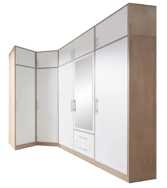 Szafy GRENADA to systemowy sposób na wypełnienie swojej garderoby bądź przedpokoju. Idealnie dobrana kolorystyka bieli oraz dodatku dębu sonoma wprowadzi ład i uporządkowanie do Twojego wnętrza. Duży wybór segmentów oraz możliwości wyboru nadstawek do szaf gwarantuje ogromne powierzchnie magazynowe w Twoim domu i idealne wpasowanie do każdego wnętrza.