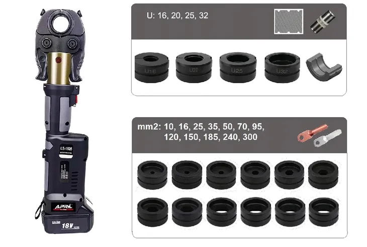 - Rozmiary matryc w zestawie: U16mm, U20mm, U25mm, U32mm, 10, 16, 25, 35, 50, 70, 95, 120, 150, 185, 240, 300 mm2