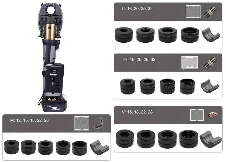 - Rozmiary matryc w zestawie: V15mm, V18mm, V22mm, V28mm, M12mm, M15mm, M18mm, M22mm, M28mm, U16mm, U20mm, U25mm, U32mm, TH16mm, TH20mm, TH26mm, TH32mm