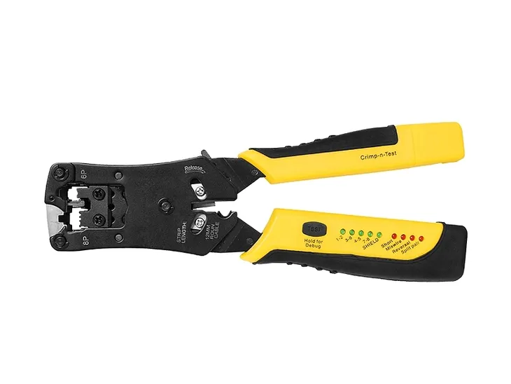 Doskonałej jakości zaciskarka, umożliwiająca zaciskanie różnego typu wtyków. Dzięki wbudowanej gilotynie oraz nożykowi, urządzenie umożliwia zdejmowanie izolacji z obrabianego kabla oraz równomierne obcięcie nadmiaru przewodu. Czołowe zaciskanie gwarantuje równomierne dociśnięcie wszystkich styków. Posiada wbudowany w rękojeść tester kabli, umożliwiający sprawdzenie zarobionego przez operatora kabla sieciowego.