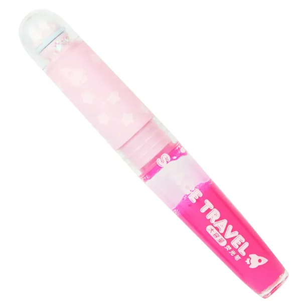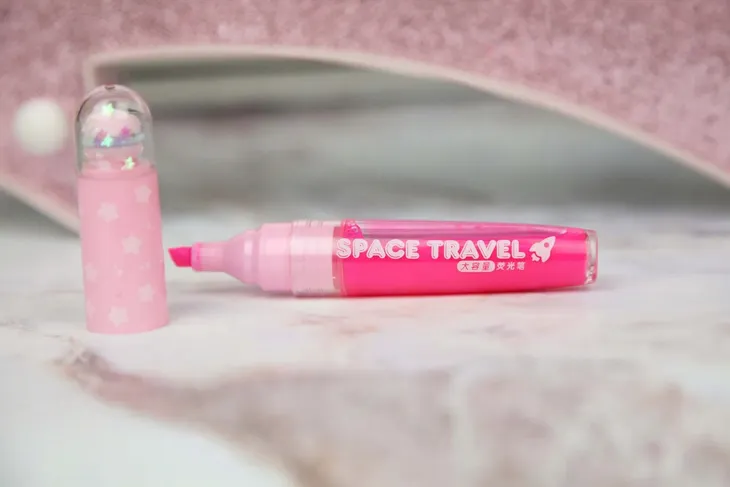 Cudowny różowy mazak/zakreślacz z zatyczką planetą i brokatowymi gwiazdeczkami.