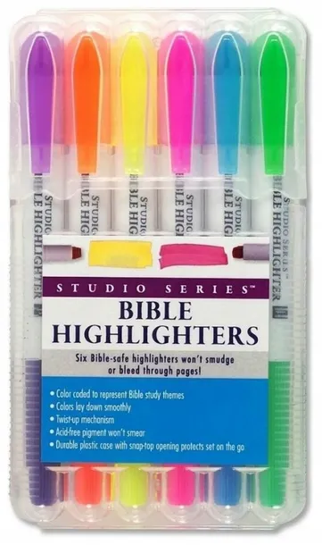 Zestaw 6 bezpiecznych dla Biblii zakreślaczy marki Peter Pauper Press. Zawiera kolory niebieski, fioletowy, zielony, różowy, pomarańczowy i żółty. Bezkwasowy pigment nie rozmazuje się na stronach oraz nie uszkadza cienkich stron. Płaskie końcówki układają się gładko na delikatnym papierze. Wytrzymała obudowa z twardego plastiku z otworem na zatrzaski chroni zestaw w podróży, może służyć również jako podstawa.