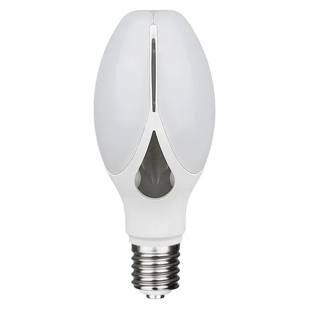 Dużej mocy żarówka LED 45W E27 zastępuje tradycyjne lampy mocy 250W. Model ten wyróżnia duży kąt świecenia 265°. Dzięki nietypowej konstrukcji żarówa dobrze sprawdza się w oprawach parkowych przy pionowym montażu