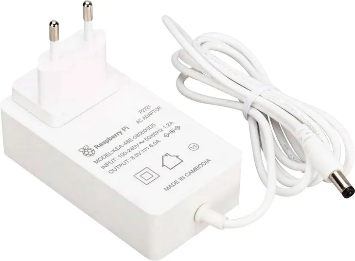 Oryginalny zasilacz w kolorze białym, wyprodukowany przez fundację Raspberry Pi. Zasilacz został stworzony do zasilania nakładki Build HAT z mikrokontrolerem RP2040. Napięcie wyjściowe zasilacza wynosi 8 V, a jego wydajność prądowa to 6 A. Maksymalna moc zasilacza to 48 W. Wyposażony we wtyk DC 5,5 / 2,1 mm o długości 11 mm. Zasilacz wyposażony w przewód 16 AWG o długości 1,5 m.