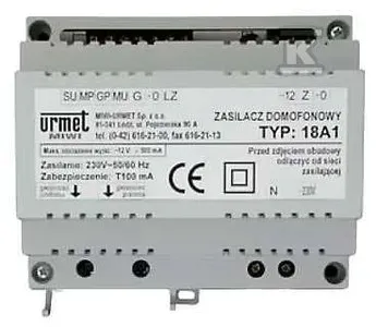 Zasilacz domofonowy 18A2 . Współpracuje z panelami MIWI, MIWUS, mod. 1127 oraz z panelami z modułami rozmównymi MR2 (mod. 725, 925), 1128/501 (Smyle). Zasilacz posiada wbudowany triak do obsługi elektrozaczepu.System: "4+n"Zasilanie: 230V AC @ 50HzMoc: 10VANapięcie wyjściowe: 12V ACMax obciążenie 12V AC: 500mAMin rezystancja generatora: ? 12.5?Generator: dwutonowyZabezpieczenie: bezpiecznik T100mA Wymiary (dł. x szer. x gł.): 106 x 90 x 66mmWymiar DIN: 6