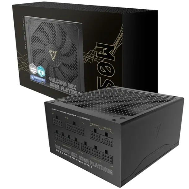 Zasilacz komputerowy HEX 850W PLATINUM ATX3.1; MODECOM Volcano Hex to seria zasilaczy Volcano, opracowana w oparciu o standardy ATX 3.1 oraz PCI Express 5.1, zapewniające obsługę zaawansowanych i wymagających rozwiązań sprzętowych na rynku. Standardy ATX 3.1/PCIe 5.1 stają naprzeciw wymaganiom najlepszych kart graficznych i definiują nie lada wyzwania dla zasilaczy komputerowych, gdyż wymaga on np. wsparcia dla chwilowych obciążeń nawet dwukrotnie większych niż moc znamionowa zasilacza. Volcano Hex to platforma zasilaczy zbudowana w topologii Half-bridge LLC Resonant; Converter, z układem DC-DC dla linii 3.3V oraz 5V, zapewniająca stabilne napięcia niezależnie od obciążenia zasilacza. H- Harmony (czyli Harmonia); Zasilacz zapewnia stabilną, cichą i zrównoważoną pracę komputera, niezależnie od obciążenia. Wszystko działa płynnie - bez zakłóceń, bez hałasu. E- Efficiency (czyli Efektywność); Dzięki wysokiej sprawności energetycznej (Cybenetics Platinum) i dopracowanej konstrukcji, zasilacz zużywa mniej prądu, a jednocześnie oddaje pełną moc tam, gdzie trzeba. X- Xtreme compatibility (czyli Ekstremalna kompatybilność); Gotowy na najnowsze podzespoły i najbardziej wymagające karty graficzne - bez przejściówek, bez kompromisów, z pełną zgodnością ze standardami ATX 3.1.