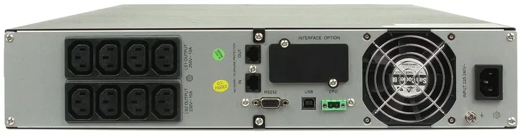 Napięcie wyjściowe: 220 / 230 / 240 V AC (czysta sinusoida) Regulacja napięcia: ± 5 % RMS dla całego zakresu napięć baterii Regulacja częstotliwości: ± 0.1 % (tryb bateryjny) Szacunkowy czas pracy na akumulatorze: 4:30 minuty (przy pełnym obciążeniu) Czas ładowania (do poziomu 90%): 3 godz. Akumulator: 6 x 12V/7Ah Liczba wyjść: 8 szt. Czas przełączenia: 2 ... 6 ms (maks. 10 ms) (13ms dla trybu generatora) Dodatkowo zabezpiecza: RJ11, RJ45 Oprogramowanie zarządzające: WinPower (Windows 98/2000/XP/Vista/7/8, MAC, Linux, FreeBSD, Solaris) Zabezpieczenia: