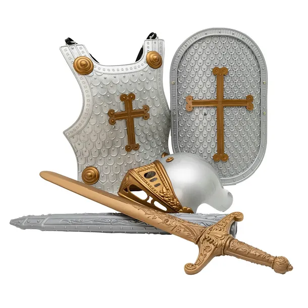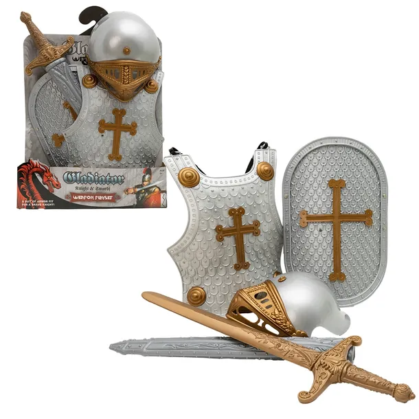 Komplet zawiera: miecz, zbroję, tarczę oraz hełm.