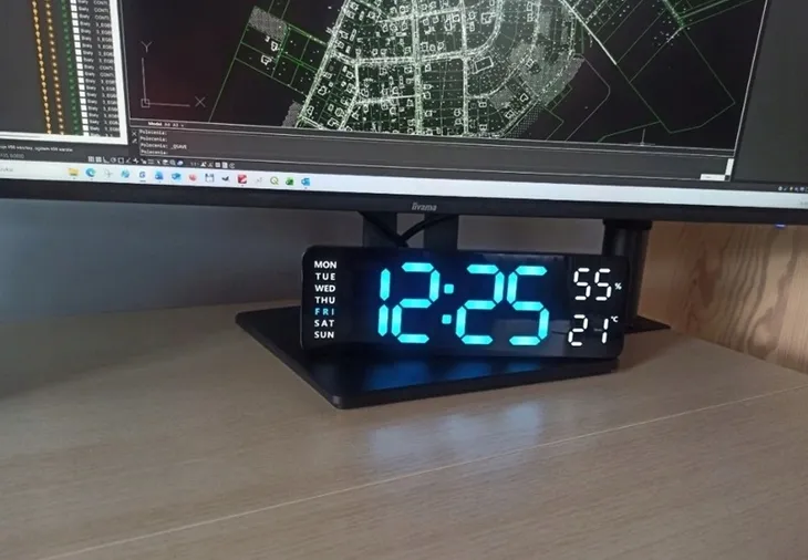 Zegar wykonano z trwałego tworzywa sztucznego, dzięki czemu jest lekki, ale wytrzymały. Smukła prostokątna forma oraz intensywna niebieska barwa LED sprawiają, że odczyt godziny jest możliwy nawet z dużej odległości, a sam produkt staje się eleganckim elementem wyposażenia.