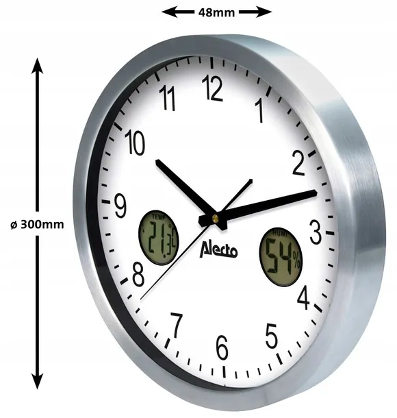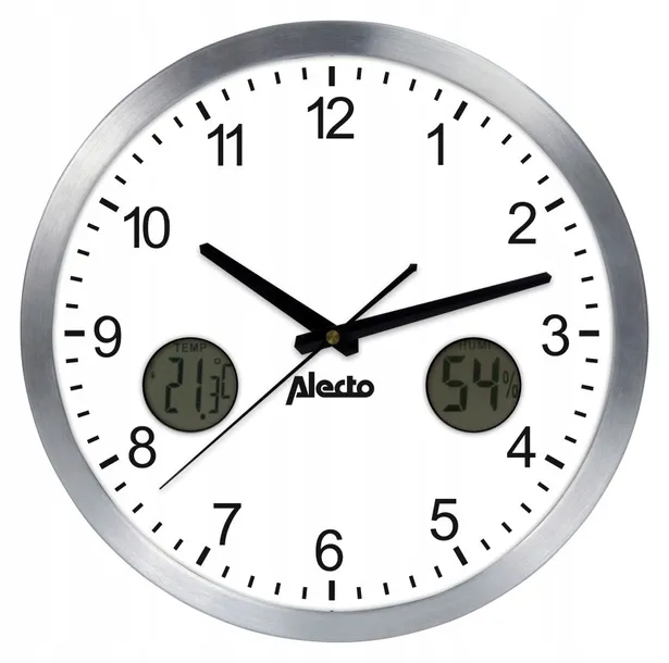 Duży kwarcowy zegar ścianny Alecto AK-15 30cm Aluminium szczotkowane pomiar wilgotności i temperatury.