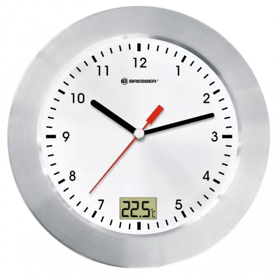 Nowy zegar łazienkowy BRESSER MyTime termo / hygro to sterowany radiowo zegar osadzony w ekskluzywnej ramie ze szczotkowanego aluminium. Ustawienie czasu oraz zmiana czasu letniego odbywa się automatycznie poprzez radiowy sygnał czasu DCF (europejski czas centralny).
