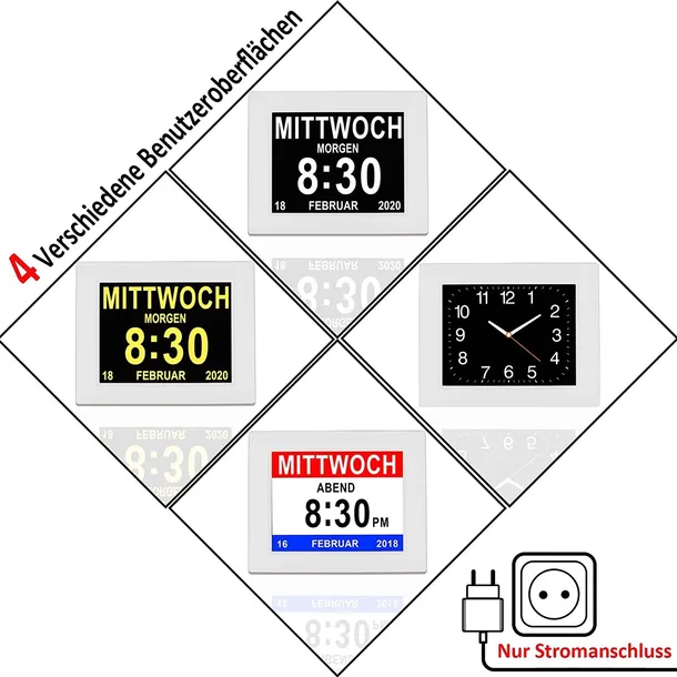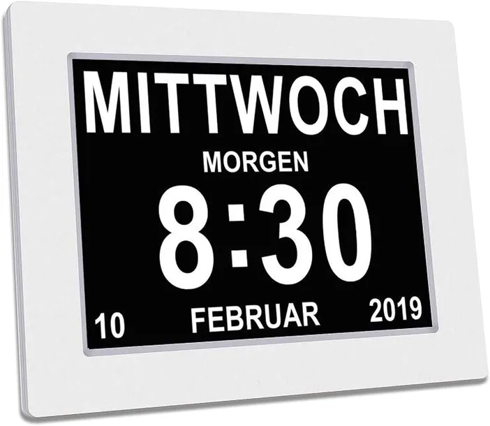 - Główne cechy: ten wyjątkowy, 20-centymetrowy, cyfrowy zegar z kalendarzem i datownikiem wyraźnie wskazuje godzinę, pełną nazwę dnia, miesiąca i datę wyraźnymi, wielkimi literami - bez mylących skrótów. 8 opcji językowych do wyboru: niemiecki, angielski, francuski, hiszpański, włoski, polski, niderlandzki. Wyświetlanie czasu w formacie 12 lub 24-godzinnym.