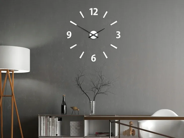 Montaż zegara jest szybki i wygodny. Tarcza ze wskazówkami jest do zamontowania na haczyk. Elementy dekoracyjne montuje się do ściany za pomocą taśmy montażowej. Każdy element jest podklejony taśmą. Zegar posiada szablon dzięki czemu w precyzyjny sposób rozmieścisz elementy na ścianie.