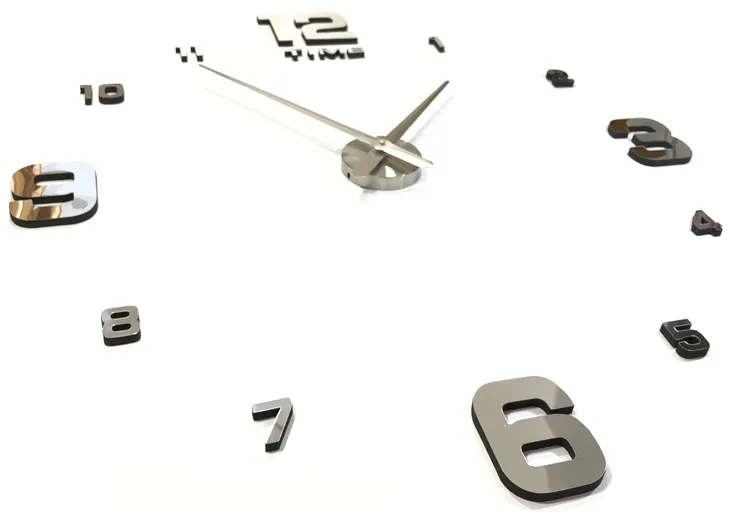 Montaż zegara jest szybki i wygodny. Tarcza ze wskazówkami wraz z elementy dekoracyjnymi montuje za pomocą taśmy montażowej do ściany. Każdy element jest podklejony taśmą.