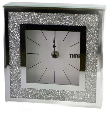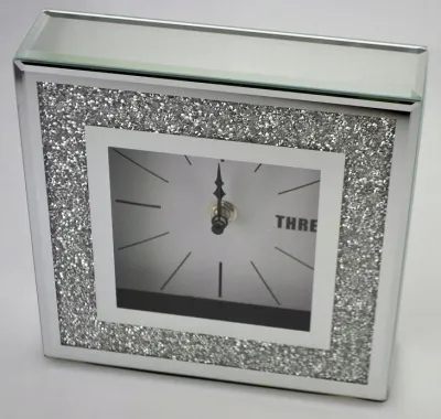 Kwadratowy zegar wykonany ze szkła, ozdobiony brokatowym wzorem. Połączenie lustrzanej powierzchni z blaskiem brokatu i prostą tarczą idealnie uzupełni modny styl glamour, ale nie tylko – z powodzeniem dopasuje się do klasyki i nowoczesności.