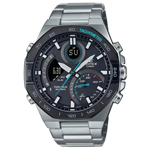 Ten zaawansowany zegarek Casio EDIFICE ECB-950DB-1AEF z serii inspirowanej motoryzacją wyróżnia się elegancką stalową kopertą i bransoletą o satynowo-polerowanym wykończeniu, co nadaje mu luksusowy, dynamiczny wygląd. Mechanizm kwarcowy zapewnia niezawodną dokładność czasu, a funkcje Bluetooth® Smart pozwalają na bezproblemową synchronizację ze smartfonem poprzez aplikację Casio Edifice Connected, umożliwiając łatwe ustawianie alarmów, stref czasowych i wyszukiwanie telefonu.