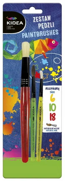 Zestaw trzech pędzli w różnych rozmiarach. Rozmiar 6, wąski pędzel przeznaczony do malowania farbami plakatowymi bardzo precyzyjnych kształtów, rozmiar 10 miękkie włosie stworzone do farb akwarelowych, oraz rozmiar 18 - szeroki pędzel do wypełniania dużych powierzchni farbami plakatowymi. Taki zestaw umożliwia namalowanie każdego obrazka.